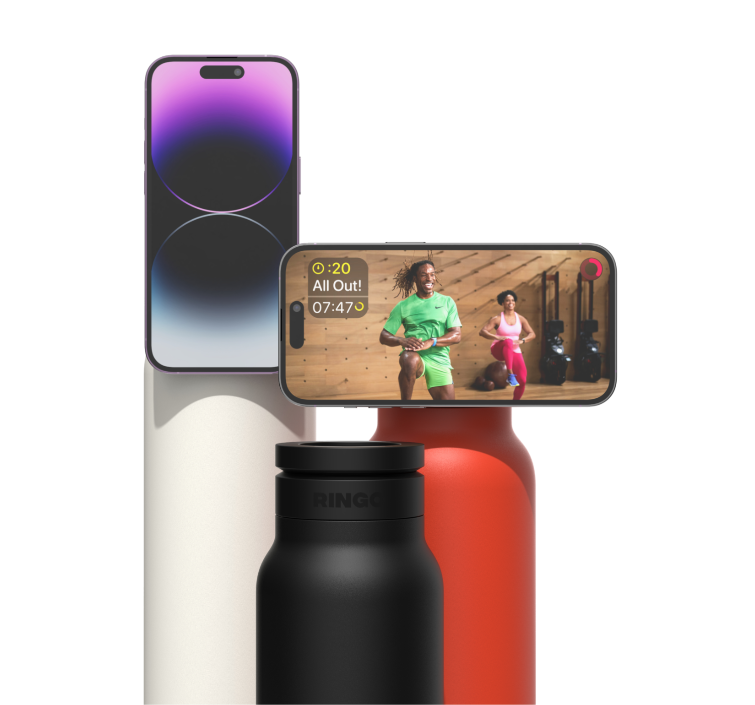- WORKS WITH MOST DEVICE: Always on the move but need your phone within reach? RINGO is the water bottle for you. Its magnetic technology is compatible with MagSafe and iPhone 12 and above. If you don't have a magnet compatible Android, iPhone or iPad, utilize the RINGO Magnetic Booster Ring (included in purchase) to easily attach your device.